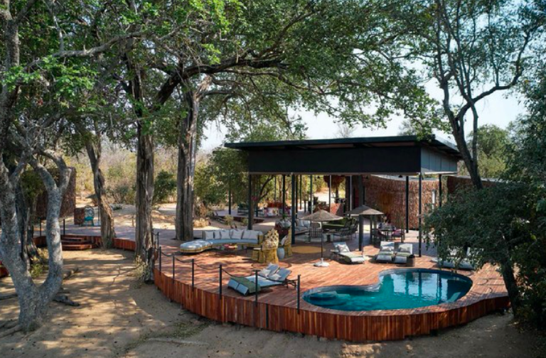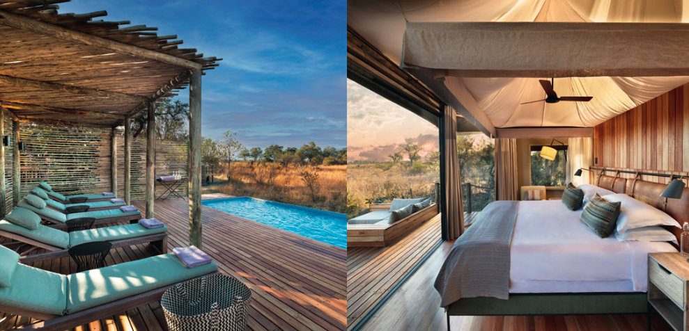Liz Biden, die Gründerin der Royal Malewane Collection, bringt Farbe in die Safariwelt: Statt auf Khaki und Beige setzt sie bei ihrem Einrichtungsstil in der Waterside Lodge auf Gelb, Rot und knalliges Blau. Gäste wählen aus acht Unterkunftsoptionen, vom geräumigen Kingsize‐Zimmer bis zur privaten Villa mit vier Schlaf‐ zimmern und eigenem Pool. Jede Unterkunft verfügt über ein Tauchbecken, eine Bar sowie eine Außendusche. Dank der Lage an einem belebten Wasserloch sind außergewöhnliche Tierbe‐ obachtungen hier so gut wie garantiert, entweder von einem gut gewählten Versteck oder von der eigenen Terrasse aus.